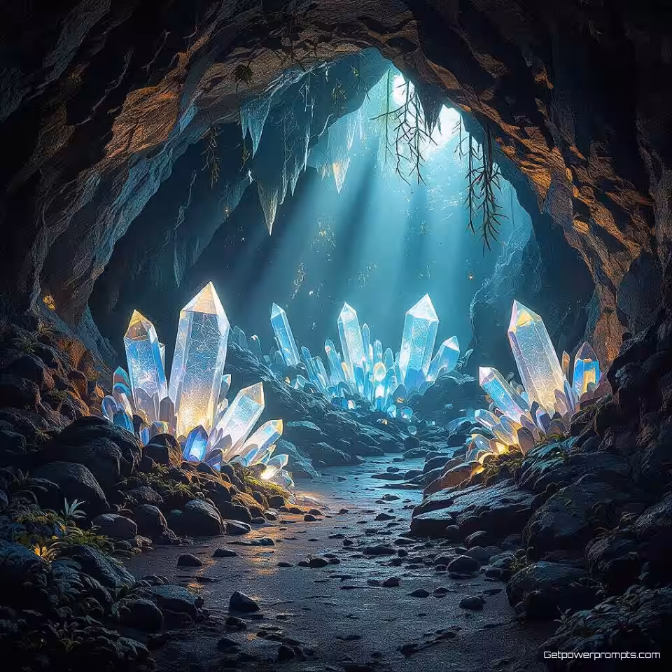 Kristalgrot met gloeiende kristallen, 3D omgevingsmodellering, fotorealistisch stijl, magisch gloeiend licht verlichting, groothoek perspectief perspectief, episch landschap omgeving, magische sfeer, gedetailleerde texturen, fantasy elementen, professionele 3D visualisatie, meeslepende scène