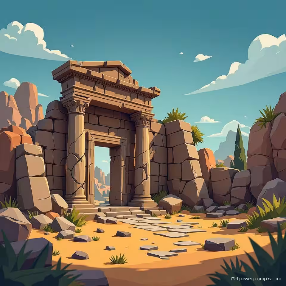 Oude ruïnes, 3D low-poly modellering, cartoon stijl stijl, studio verlichting verlichting, effen kleur achtergrond achtergrond, gestileerde texturen, game-ready asset, geoptimaliseerde geometrie, schone topologie, professionele game development visualisatie