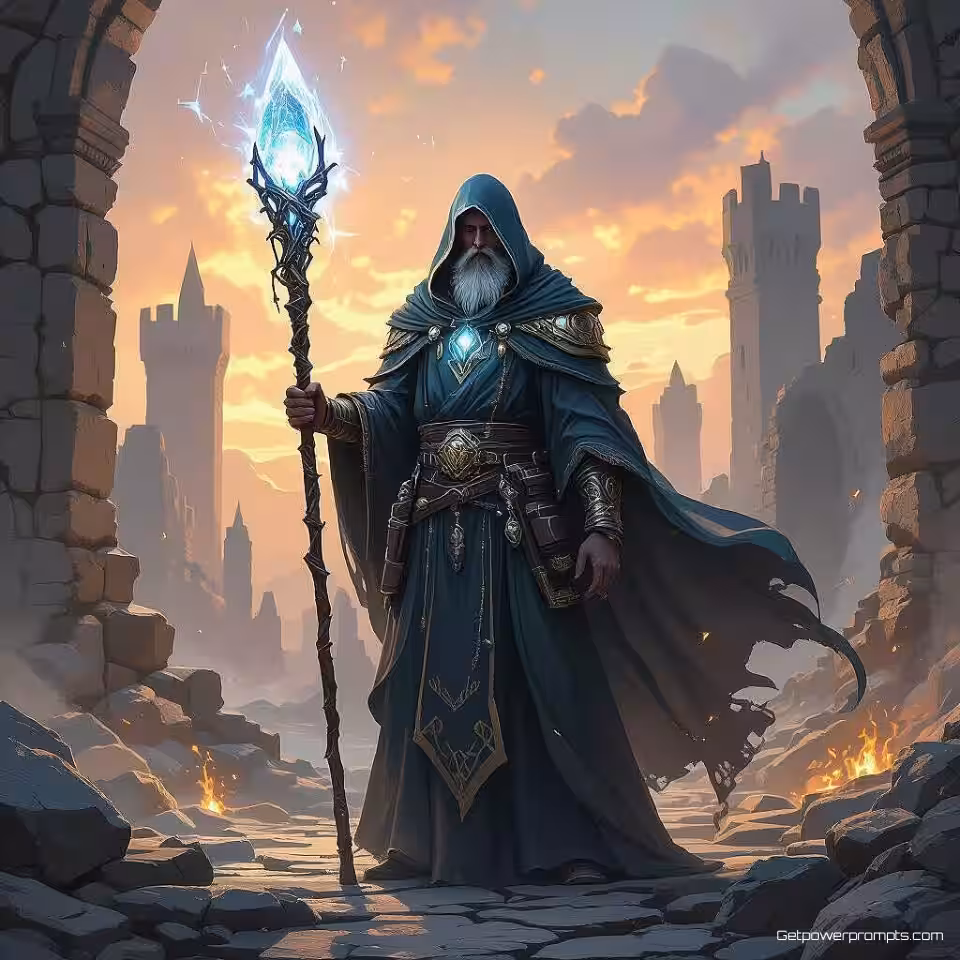 Oude tovenaar met gloeiende kristallen staf, concept art, heldhaftig sfeer, dramatische verlichting verlichting, fantasy architectuur achtergrond, gedetailleerd karakterontwerp, fantasy esthetiek, cinematografische kwaliteit