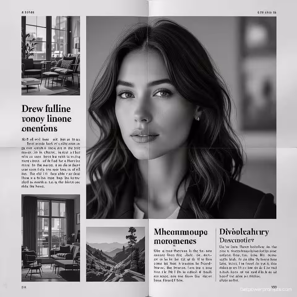 Genereer kant-en-klare tijdschrift lay-outs met volledige controle over visuele stijl, kleurenpalet en compositie voor redactionele inhoud