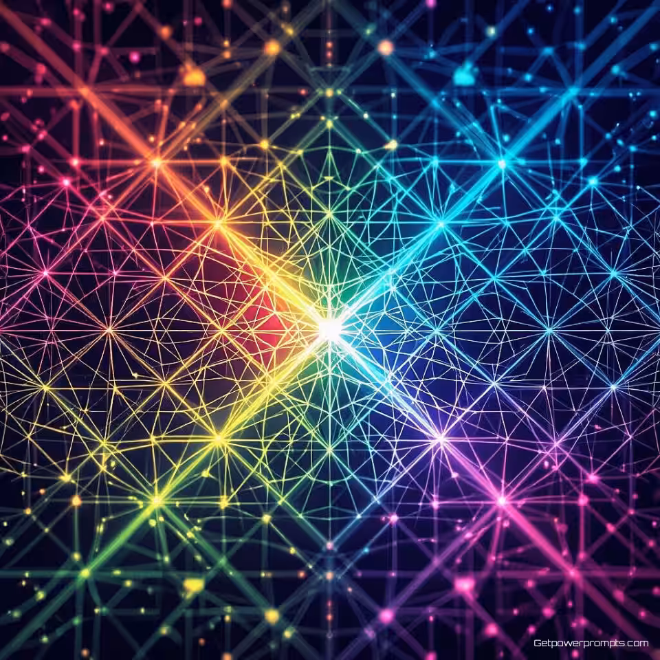 Geometrisch raster, digitale kunsttextuur, cyberpunk, futuristisch ontwerp, neon regenboog, gloeiend verlichting, iriserend oppervlak, geometrische interferentiepatronen, naadloze herhaling, etherische gloed, digitaal hologram effect, ingewikkelde lichtbreking