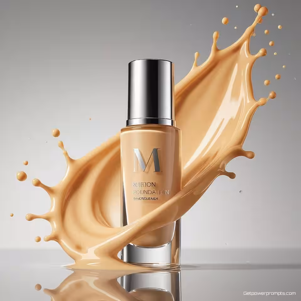 Vloeibare foundation, bewegingsfotografie, redactioneel stijl, studiobelichting belichting, schone studio achtergrond, dynamische beweging, vloeiende elementen, elegant sfeer, professionele schoonheidsesthetiek, bewegingsonscherpte effecten, redactionele kwaliteit, commerciële fotografie