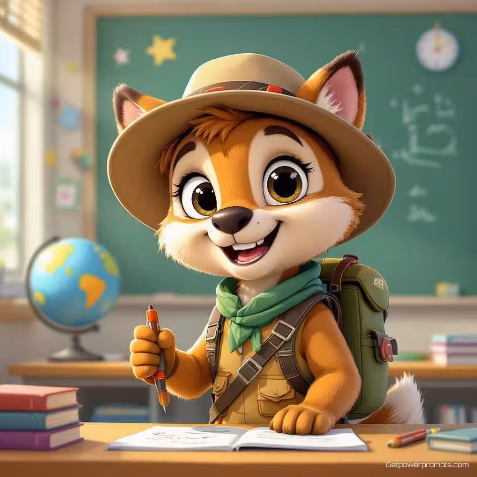 Avontuurlijke dierenontdekker, karakterillustratie, cartoon, vriendelijk uitdrukking, heldere kleuren kleurenschema, klaslokaal achtergrond, educatieve context, boeiende persoonlijkheid, duidelijke visuele vertelling, kindvriendelijk ontwerp