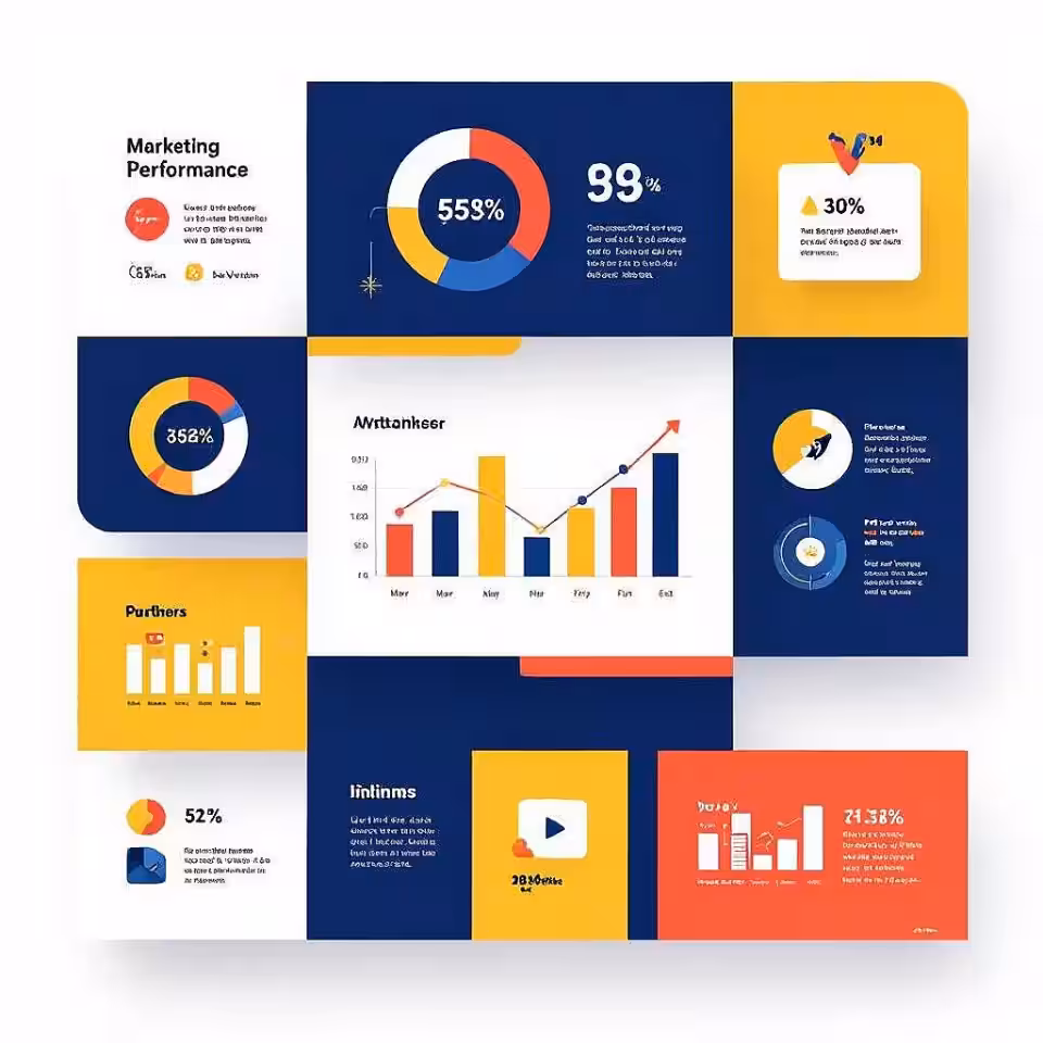 Marketingprestatiegegevens, minimalistisch infographic ontwerp, Felle primaire kleuren kleurenschema, Modulaire rastercompositie lay-out, schone typografie, geometrische datavisualisatie-elementen, Effen gekleurde achtergrond achtergrond, plat ontwerp esthetiek, professionele datapresentatie, negatieve ruimte, moderne informatiedesign
