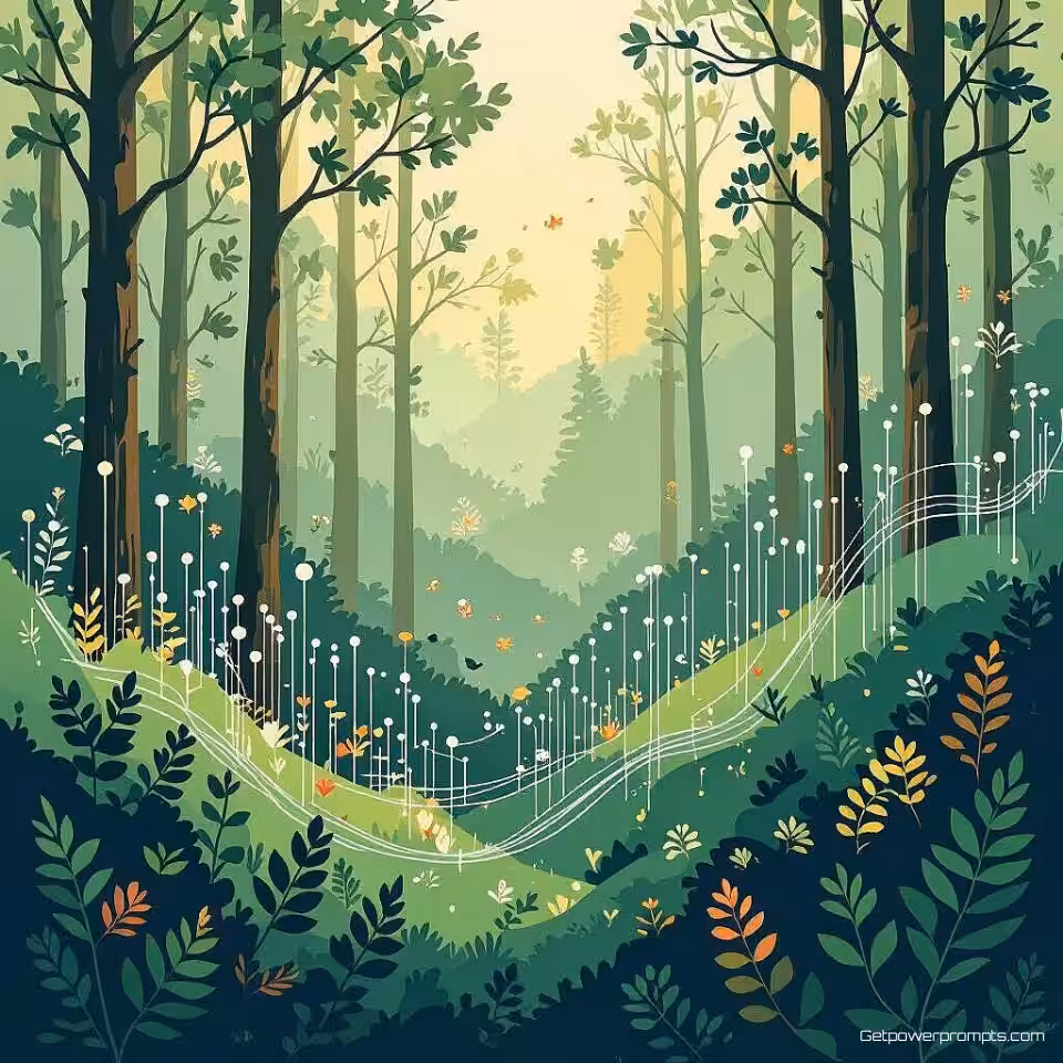 Bosbehouddata, digitale schildering infographic ontwerp, aardtinten kleurenschema, organische natuurlijke vormen compositie, textuurachtergrond achtergrond, vloeiende datastromen, botanische illustratie-elementen, zacht natuurlijk licht verlichting, ecologische datavisualisatie, duurzaam ontwerp esthetiek, natuurlijke patronen, milieu-informatieontwerp