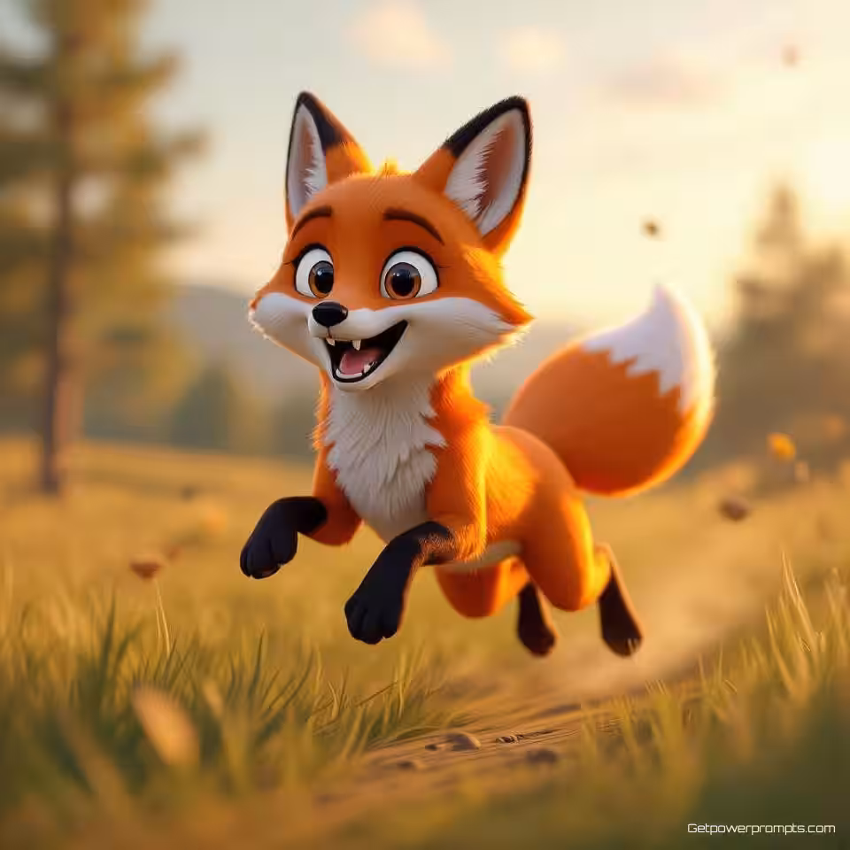 Speelse vos mascotte, rennend met energie, dynamische karakterillustratie, 3D render, natuurlijk landschap omgeving, zacht licht verlichting, energieke beweging, levendige kleuren, mascotte in actie, expressief karakterontwerp, commerciële illustratie