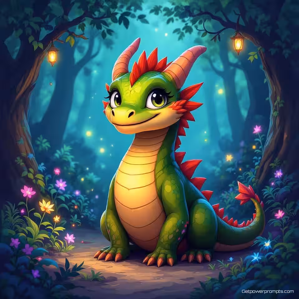 Vriendelijke draak, betoverd bos omgeving, digitale schildering, magische gloed verlichting, magische sfeer, pastelkleuren, gedetailleerd karakterontwerp, speelse elementen, betoverende scène, commerciële fantasy illustratie