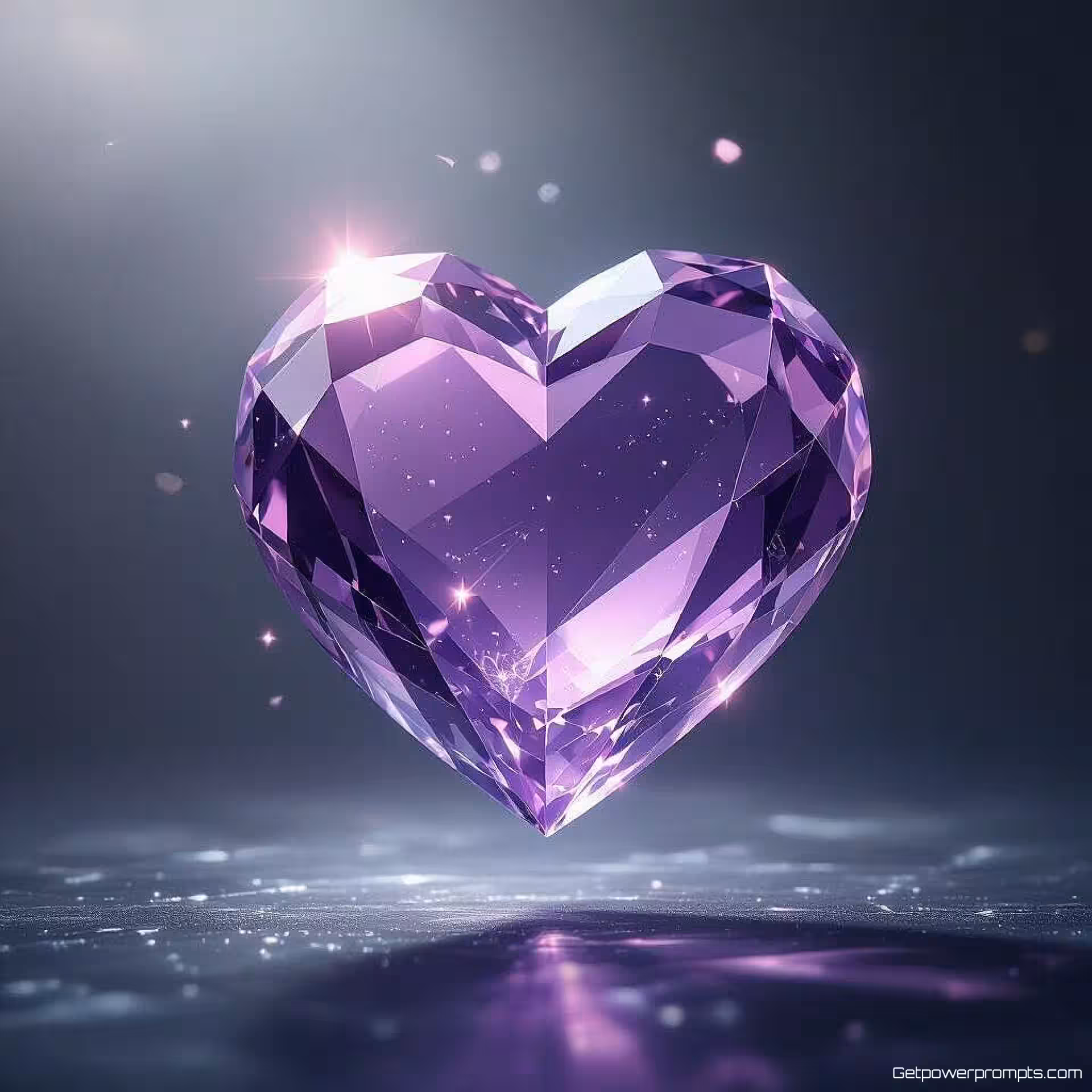 Hart, zwevende kristal geometrie, amethist materiaal, etherische gloed verlichting, donkere gradiënt achtergrond, zwevende compositie, etherische gloed, geometrische precisie, doorschijnende breking, professionele branding, scherpe focus, commercieel gebruik