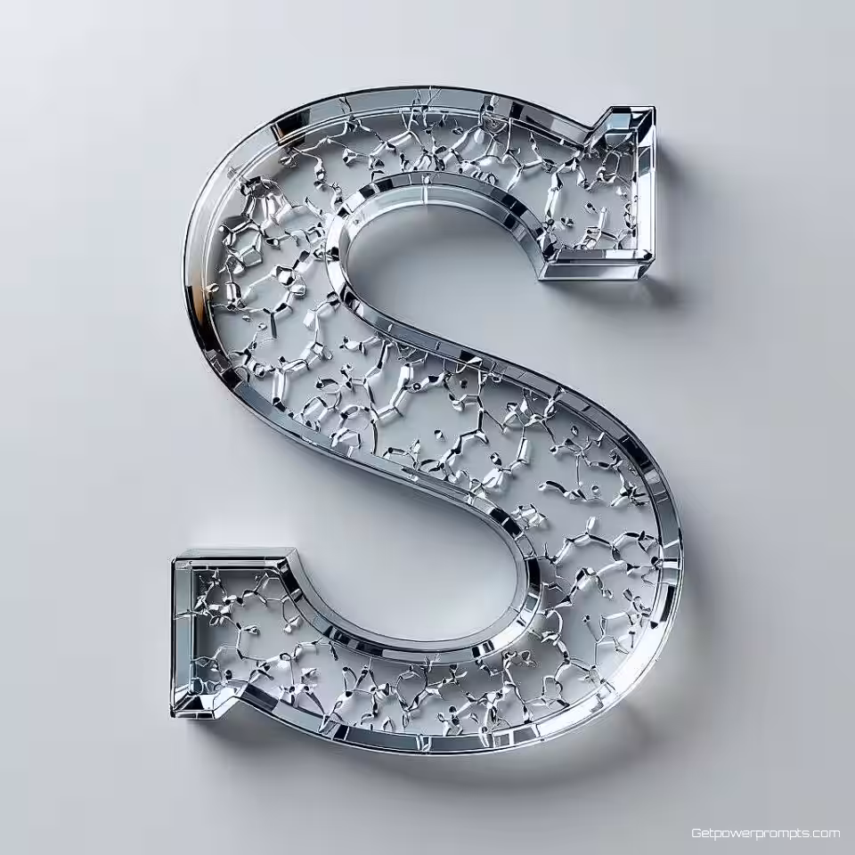Elegante S letter, kristal glas glasoppervlak, fotorealistisch weergave, studioverlichting verlichting, witte achtergrond achtergrond, gegraveerde typografie, transparant materiaal, professionele branding, gedetailleerde close-up, realistische glastextuur, lichtbrekingseffecten