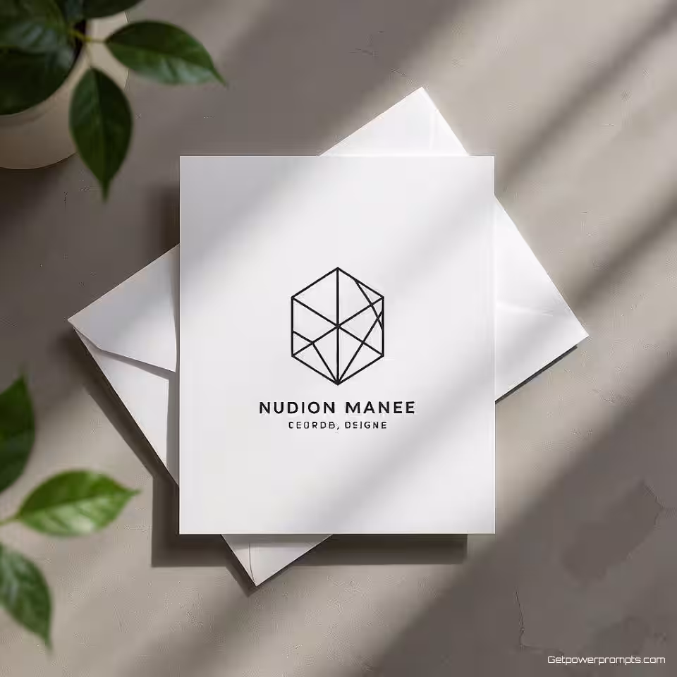 Minimalistisch geometrisch logo, kantoorartikelen mockup mockup, mat papier oppervlak, zacht daglicht verlichting, professioneel en schoon sfeer, professionele merkpresentatie, realistische materiaaltexturen, schone compositie, merkidentiteitsvisualisatie