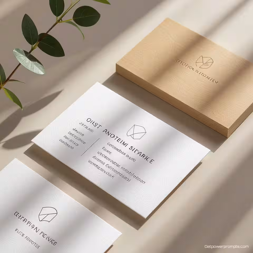 Minimalistisch merkteken, visitekaartje mockup, gerecycled papier materiaal, gebosseleerd afwerking, zacht studio licht verlichting, {{sfeer}} sfeer, professionele briefpapier presentatie, realistische papiertextuur, schone typografie, merkidentiteit toepassing, subtiele schaduwen, corporate branding