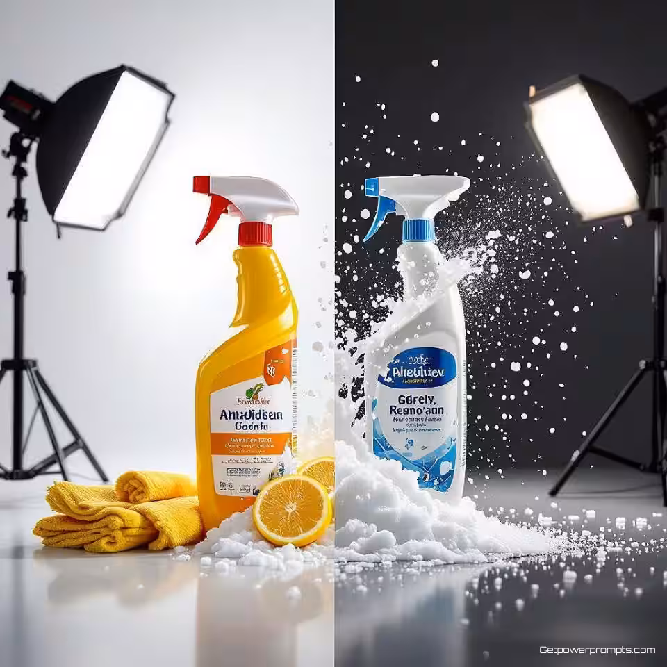 Vlekverwijderaar, voor en na onthulling fotografie, fotorealistisch, studiobelichting belichting, studio achtergrond achtergrond, dramatisch transformatiemoment, professionele productfotografie, visuele impact, commerciële esthetiek, dynamisch onthullingseffect, split-second transformatie vastlegging
