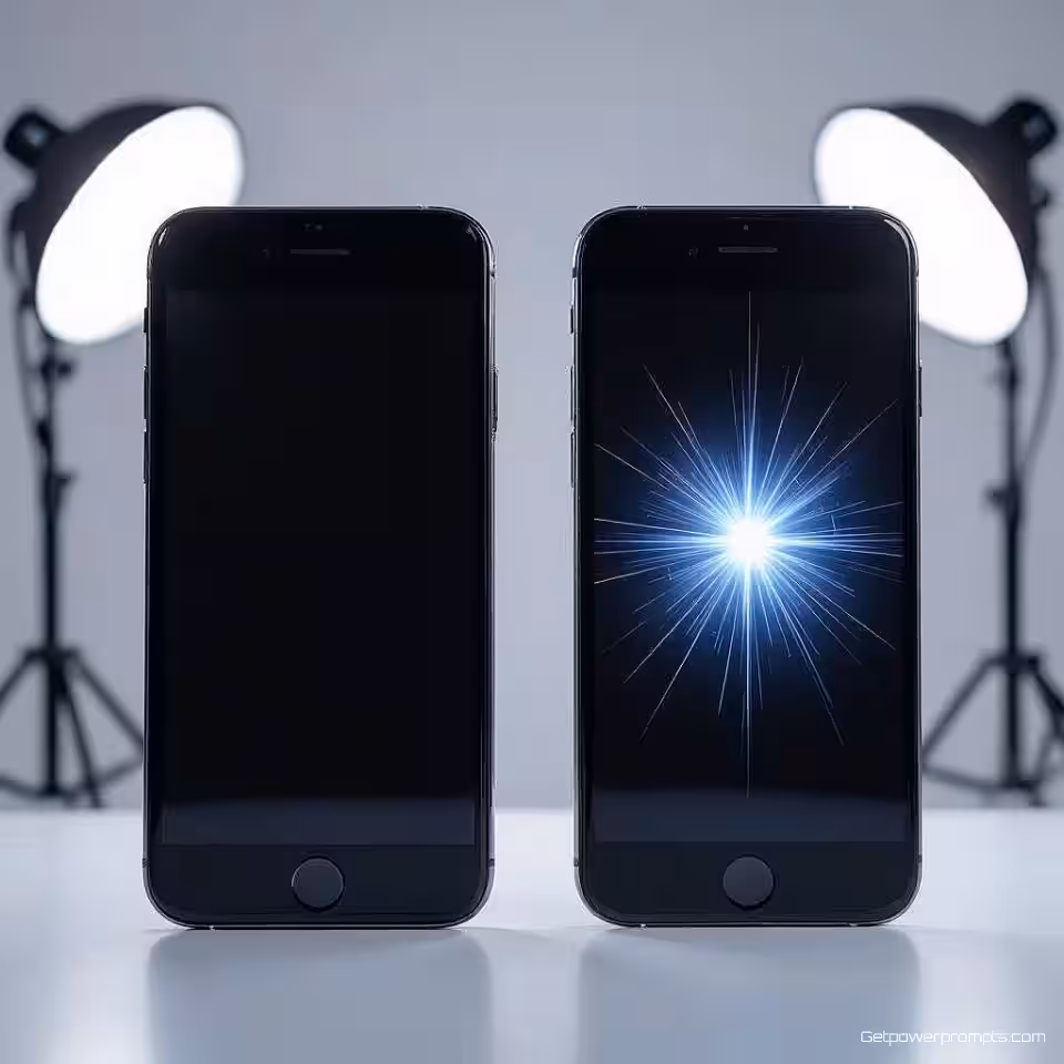Smartphone voor en na transformatie, vergelijkende fotografie, witte studio achtergrond, studiobelichting verlichting, close-up perspectief, professionele esthetiek, scherpe focus, zij-aan-zij lay-out, commerciële stijl