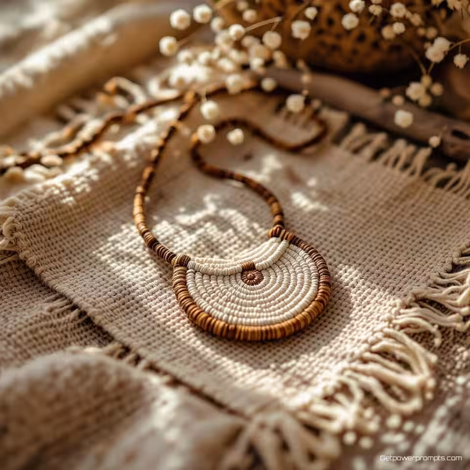 Handgemaakt halsketting, bohemien flat lay fotografie, geweven wandtapijt achtergrond, zacht natuurlijk licht belichting, vogelperspectief perspectief, eclectische opstelling, aardetinten kleurenschema, natuurlijke elementen, textuurrijke stoffen, artistieke styling, ondiepe scherptediepte, warme ambiance gloed, vrijgevochten esthetiek