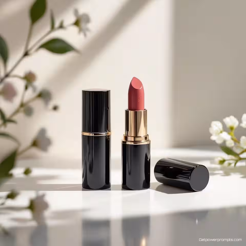 3. **Compositie**: Rangschik de lippenstiften en andere schoonheidsproducten symmetrisch of in geometrische patronen, met de focus op het centrale product.