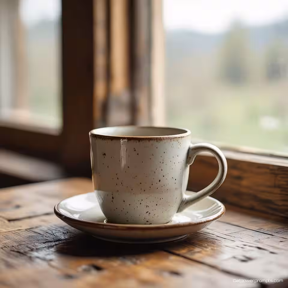 Ambachtelijke keramische koffiemok, lifestyle flat lay fotografie, rustieke houten tafel achtergrond, natuurlijke raamverlichting verlichting, vogelperspectief compositie perspectief, zachte achtergrond focus, authentieke lifestyle esthetiek, ondiepe scherptediepte, commerciële productpresentatie