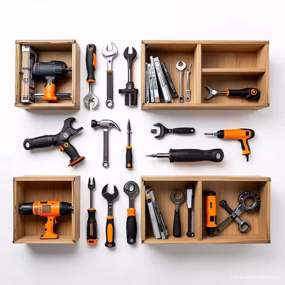 Boekenkast montage, meerdere compatibele gereedschappen demonstratie, technische illustratie, close-up perspectief, zacht daglicht verlichting, neutrale werkbank achtergrond, compatibel gereedschap showcase, alternatieve gereedschapsopties, educatieve compatibiliteitsgids, gereedschapsselectie visualisatie, meerdere gereedschapsarrangementen, duidelijke compatibiliteitsindicatoren