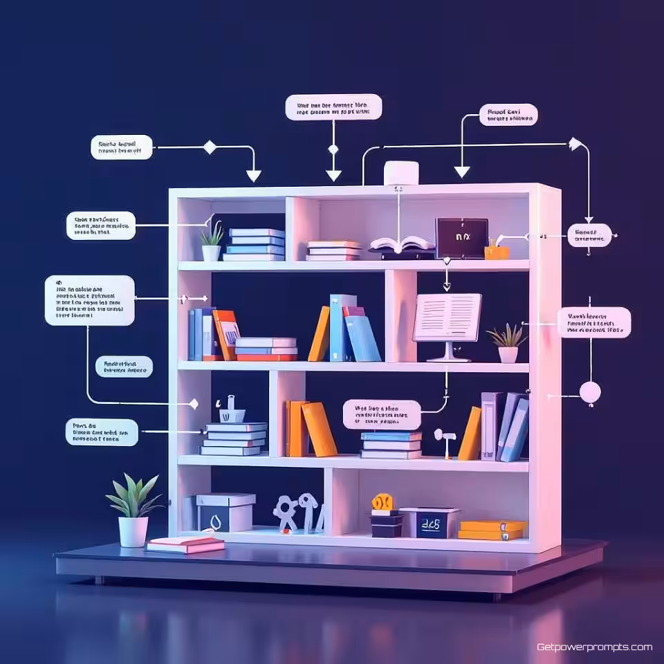 Boekenkast, diagram van het assemblageproces, technische illustratie, visualisatie van opeenvolgende stappen, wit achtergrond, studio verlichting, educatief werkstroomdiagram, richtingspijlen, processtroomindicatoren, duidelijke voortgangsmarkeringen