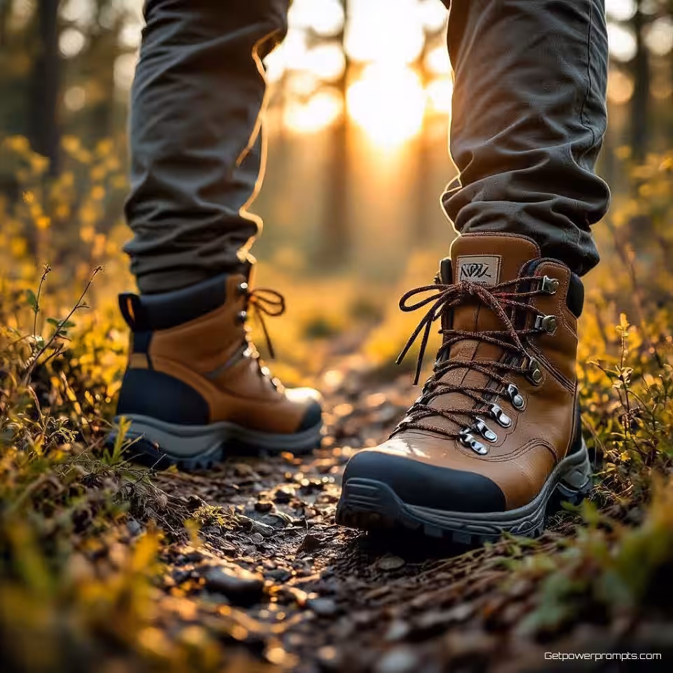 Waterdichte wandelschoenen, outdoor avontuur fotografie, bospad omgeving, gouden uur verlichting verlichting, avontuurlijke sfeer sfeer, actiegerichte compositie, robuuste natuurlijke elementen, authentiek outdoor gebruik, dynamisch perspectief, ondiepe scherptediepte, omgevingsverhaal