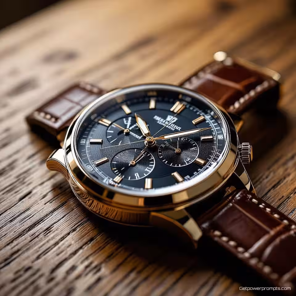 Luxe polshorloge, macro productfotografie, houten tafeloppervlak achtergrond, studiobelichting belichting, extreme close-up perspectief, extreme close-up, textuurdetail showcase, professionele e-commerce presentatie, scherpe focus, materiaaleigenschappen highlight