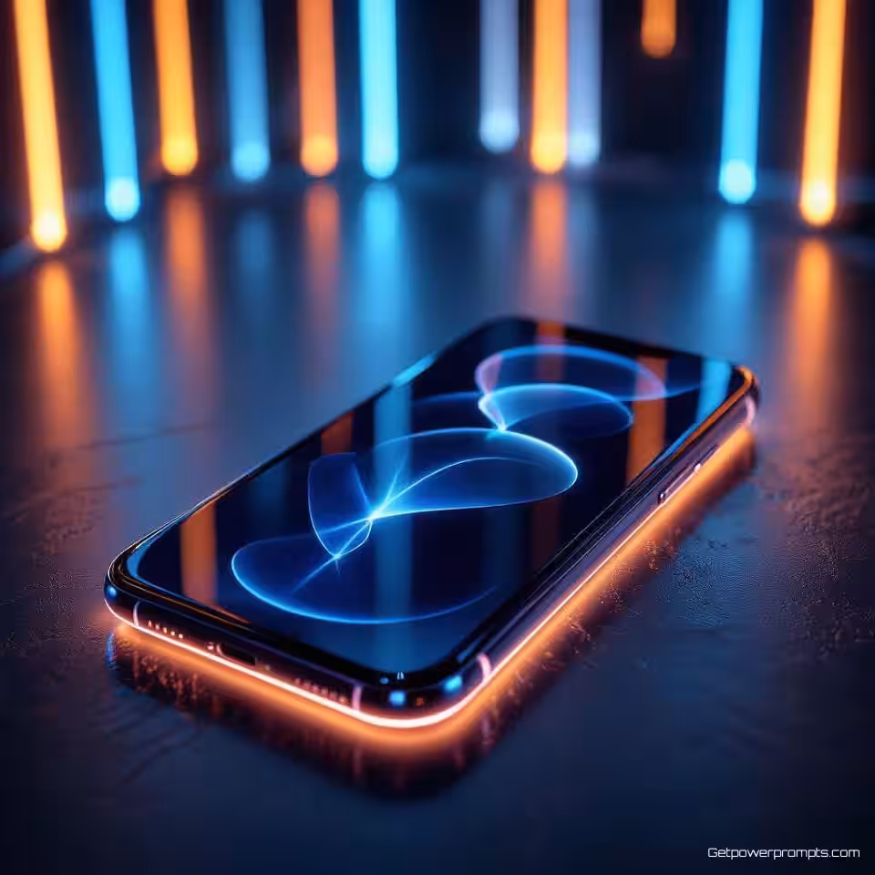 Premium smartphone, gloeifotografie, donker verloop achtergrond, randverlichting verlichting, close-up perspectief, warm wit, etherische productgloed, professionele e-commerce presentatie, lichtgevende randen, atmosferische verlichtingseffecten, commerciële esthetiek, stralende productshowcase, zachte lichtemissie