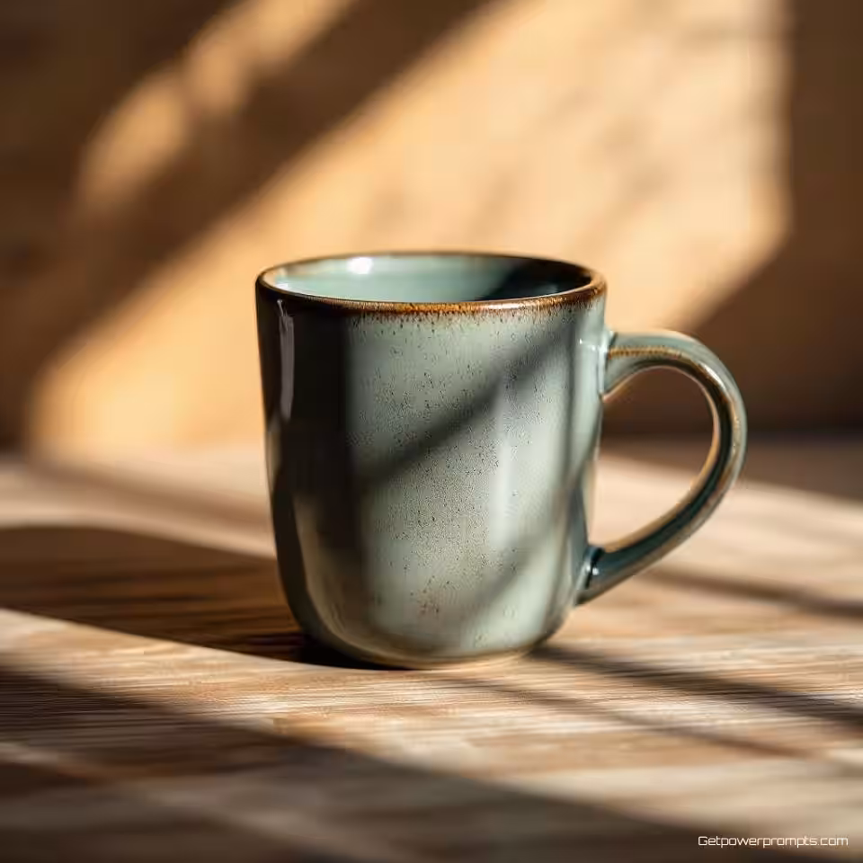 Ambachtelijke keramische koffiemok, creatieve schaduwfotografie, natuurlijke houttextuur achtergrond achtergrond, dramatische zijverlichting verlichting, close-up compositie perspectief, scherpe gedefinieerde schaduwen schaduweffect, professionele e-commerce presentatie, scherpe focus, artistieke schaduwcompositie, commerciële esthetiek, dramatische visuele verhaalvertelling, verbeterde productdimensie