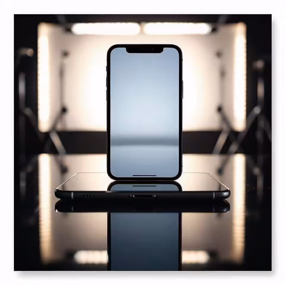 Smartphone, reflectiefotografie, donkere studio achtergrond, studioverlichting verlichting, symmetrisch perspectief, glazen oppervlak reflectieoppervlak, spiegelachtig reflectie-effect, professionele e-commerce presentatie, scherpe focus, symmetrische compositie, commerciële esthetiek, verbeterde visuele aantrekkingskracht
