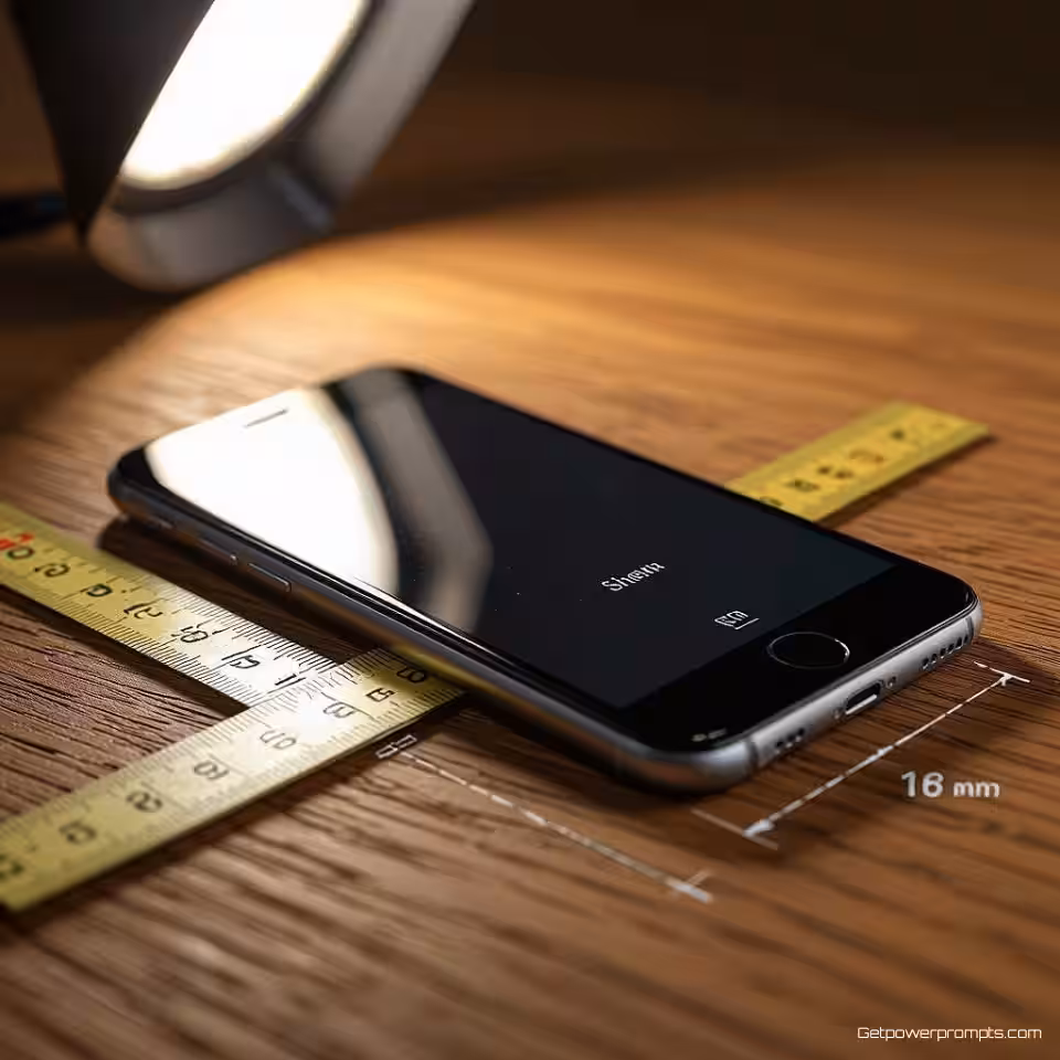 Smartphone, productdetailfotografie, natuurlijk hout achtergrond, studiobelichting verlichting, close-up perspectief, meetschaaloverlay, precieze dimensionale referentie, technische productpresentatie, commerciële kwaliteit, professionele styling, scherpe focus, schone presentatie
