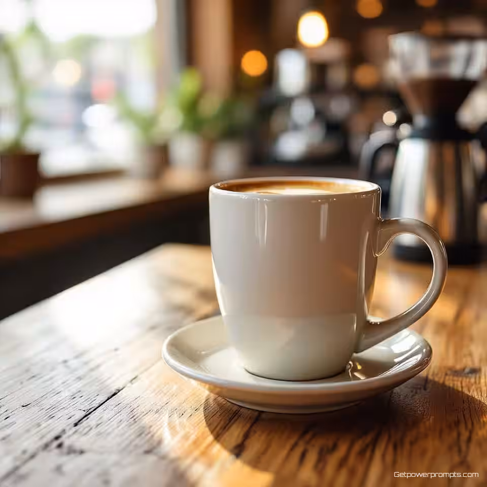 Ambachtelijke koffiemok, lifestyle fotografie, gezellig sfeer, koffiebar achtergrond, natuurlijk daglicht verlichting, zachte achtergrond focus, spontane stijl, authentiek moment, natuurlijke setting