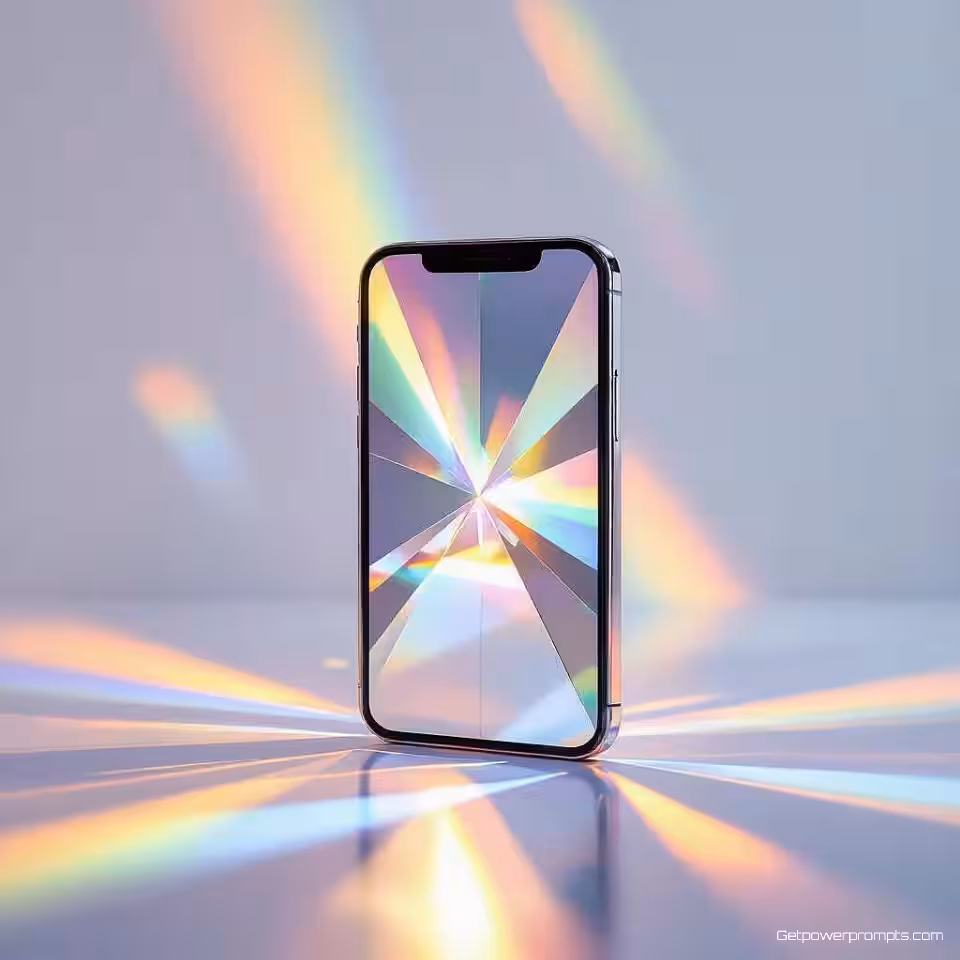 Smartphone, creatieve prismafotografie, geometrische vervorming lichtbreking, studio spotlicht belichting, close-up perspectief, minimalistisch, professionele productpresentatie, regenbooglichtpatronen, scherpe focus, commerciële esthetiek, geometrische lichtvervorming, kristalachtige optische effecten