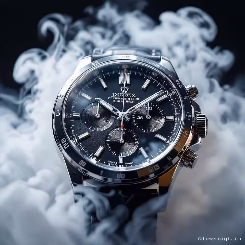 Luxe polshorloge, creatieve rookfotografie, dichte rookwolken rookeffecten, dramatische tegenlichting belichting, close-up shot perspectief, minimalistische stijl, professionele productpresentatie, atmosferische rookpatronen, scherpe productfocus, commerciële esthetiek, dramatische sfeer
