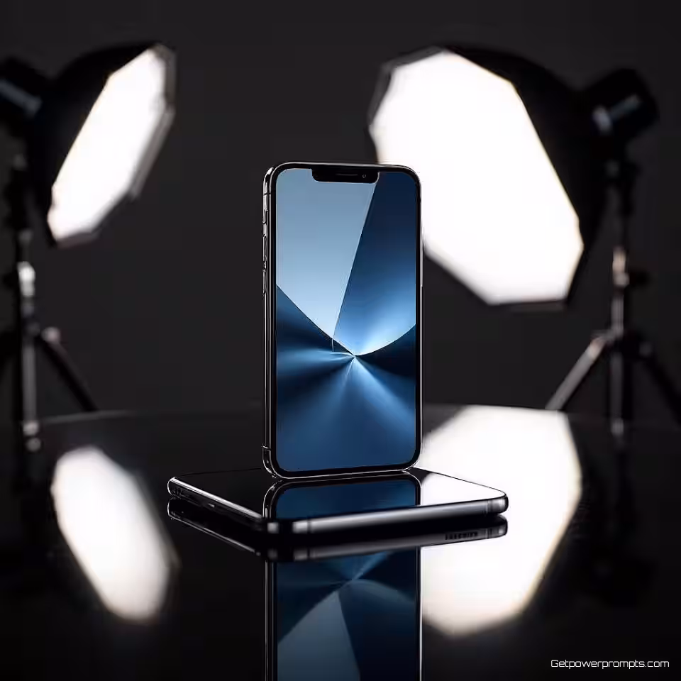 - **Studio Verlichting Verlichting**: Zachte, gelijkmatige studioverlichting (zoals softboxes) wordt gebruikt om schaduwen te minimaliseren en de reflecties en details van de smartphone en marmer te accentueren, met eventueel een accentlicht voor highlights.