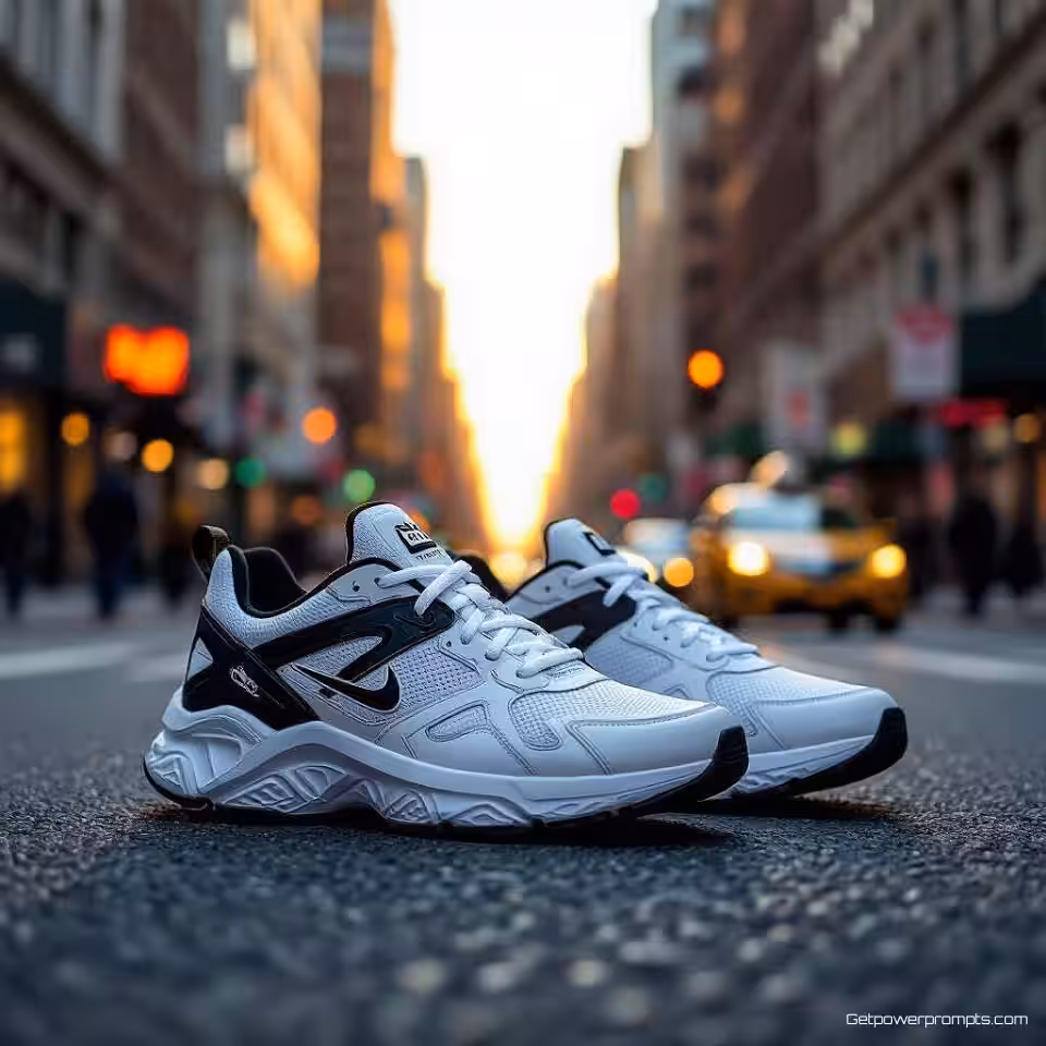 Atletische sneakers in een levendige stedelijke setting, vastgelegd met een fotorealistische stijl. Op de achtergrond een drukke stadstraat vol beweging, verlicht door zacht natuurlijk daglicht dat een spontane en authentieke sfeer creëert. Dit promotiebannerontwerp combineert straatfotografie met commerciële aantrekkingskracht, waarbij de dynamische compositie en lifestyle-context de energie van het stadsleven perfect weergeven.