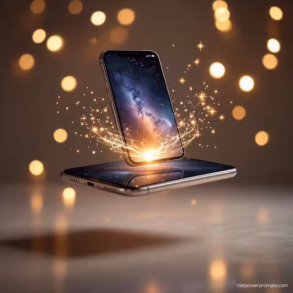 3. **Zachte gloed en etherische gloed**: Voeg een zachte, diffuse gloed rondom de smartphone toe. Dit geeft een magisch en etherisch gevoel, alsof het apparaat een eigen licht uitstraalt.
