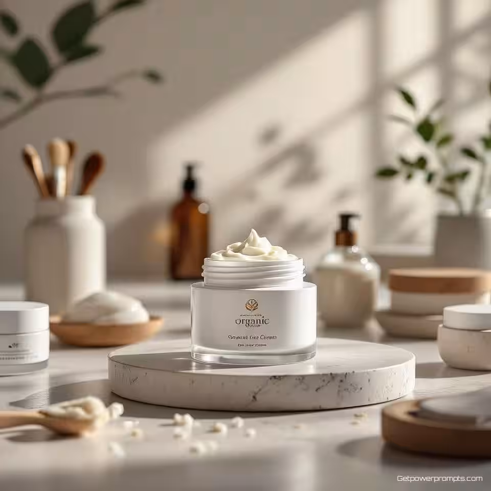 Organische Gezichtscrème verpakking, fotorealistisch, ontwerpstudio achtergrond, zacht daglicht verlichting, creatief sfeer, ontwerper studio omgeving, creatieve werkruimte setting, ontwerpgereedschappen zichtbaar, professionele ontwerpstudio, authentiek creatief proces, commerciële fotografie, natuurlijke compositie, gedetailleerde vakmanschap focus