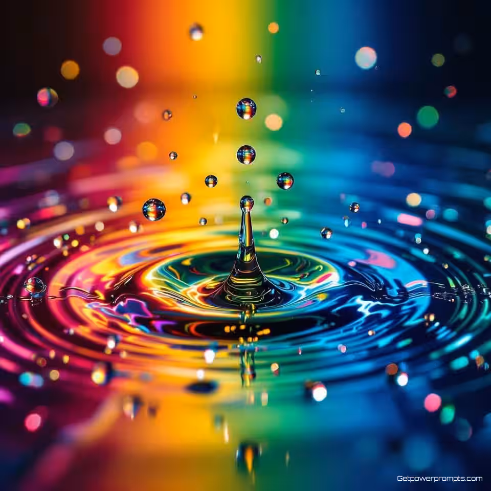 Waterdruppels, experimentele vloeistoffotografie, fotorealistisch, levendige regenboog, macroperspectief, studio achtergrondverlichting verlichting, effen zwart achtergrond, vloeistofdynamica, organische beweging, abstracte patronen, hogesnelheidscapture, oppervlaktespanningseffecten, levendige druppels, artistieke compositie