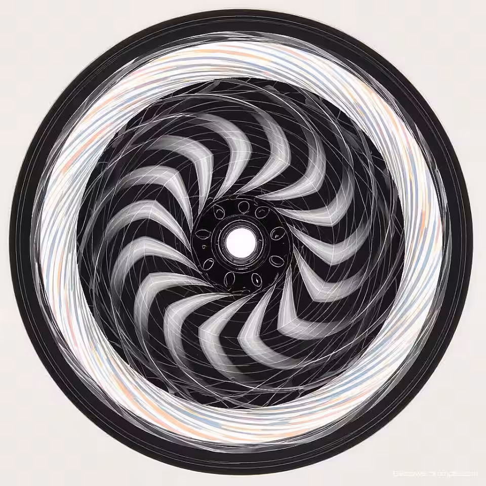 Draaiend wiel, experimentele kinetische fotografie, fotorealistisch, monochroom, studio verlichting verlichting, effen achtergrond achtergrond, bewegingsonscherpe effecten, dynamische bewegingspatronen, time-lapse compositie, abstracte bewegingssporen, bevroren animatie, energieflowvisualisatie, temporele vervorming, experimentele opnametechnieken