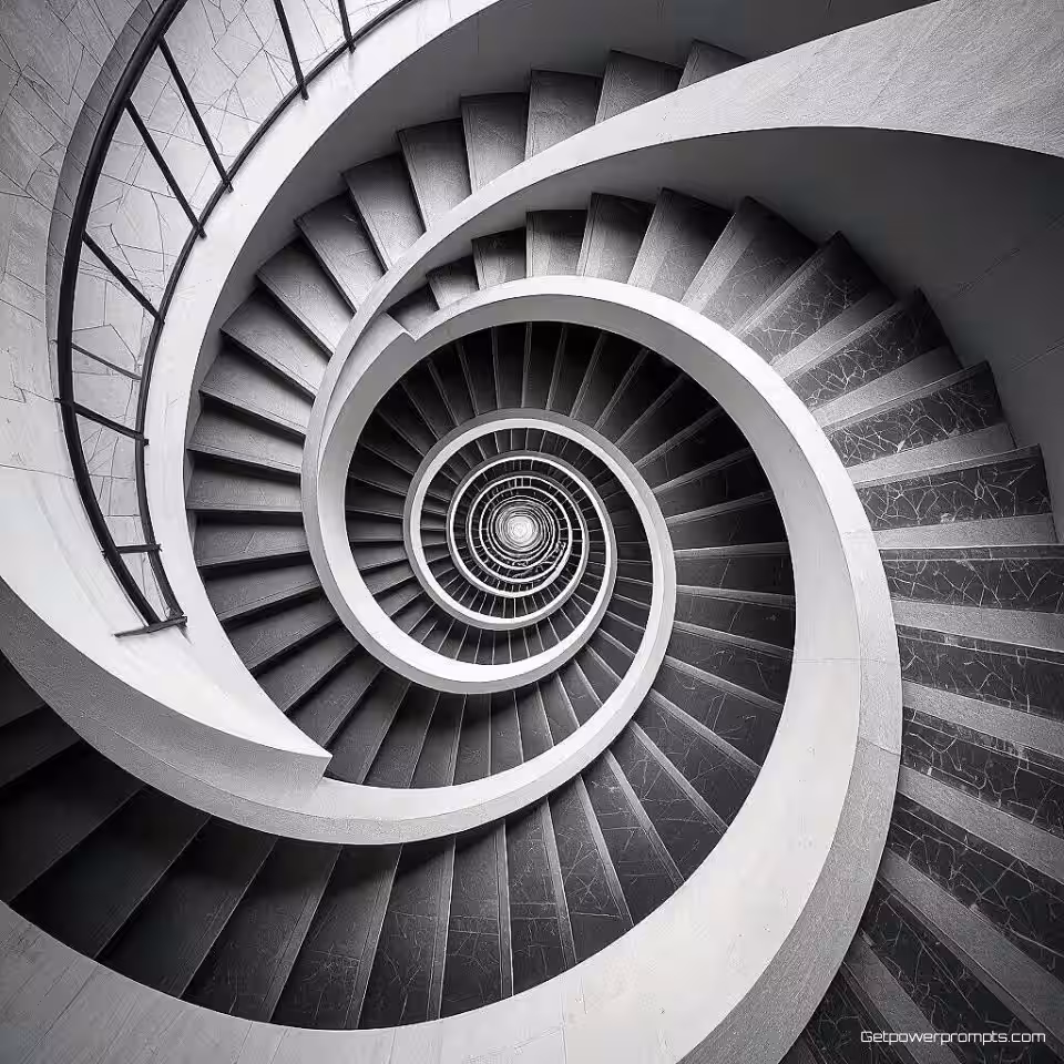 Wenteltrap, abstracte architectuurfotografie, surrealistisch stijl, close-up perspectief, monochroom kleurenschema, dramatische belichting, geometrische patronen, artistieke interpretatie