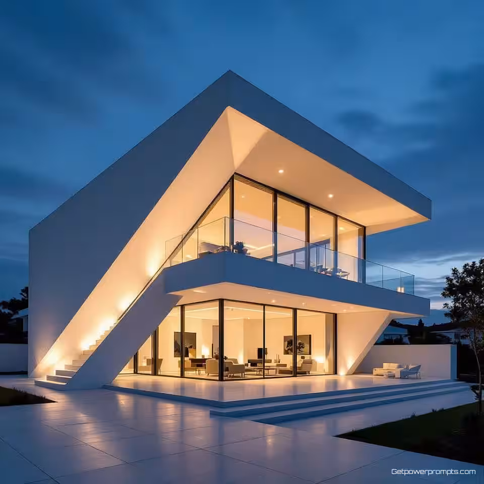 Genereer professionele architectuurbeelden met schone minimalistische esthetiek, ideaal voor moderne architectuurportfolio's, vastgoedmarketing en architectuurpublicaties. Focus op geometrische vormen en negatieve ruimte om visueel opvallende composities te creëren.