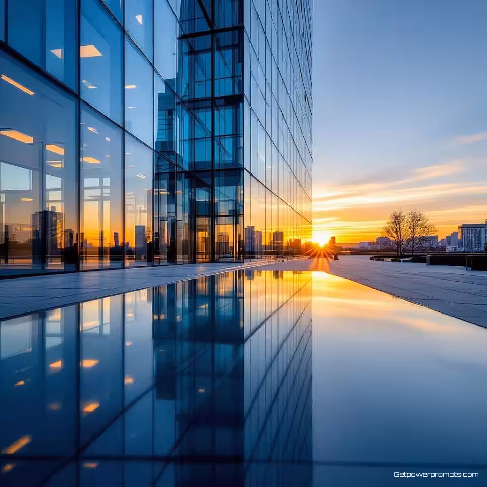 Een hedendaagse glazen wolkenkrabber torent hoog uit tegen de stedelijke skyline. In de rustige vijver ervoor weerspiegelt de architectuur perfect, een vlekkeloze, symmetrische reflectie die het geheel verdubbelt. Het warme licht van het gouden uur strijkt zacht over de gevel, benadrukt de serieuze, monumentale sfeer en creëert diepe, langgerekte schaduwen. De compositie is strak gecentreerd, met scherpe focus op elke lijn en vorm, vastgelegd in krachtig zwart-wit voor een tijdloos, professioneel architectuurbeeld. Het wateroppervlak fungeert als een spiegel, waardoor de reflecties van glas en staal een harmonieus spel vormen tussen werkelijkheid en weerspiegeling.