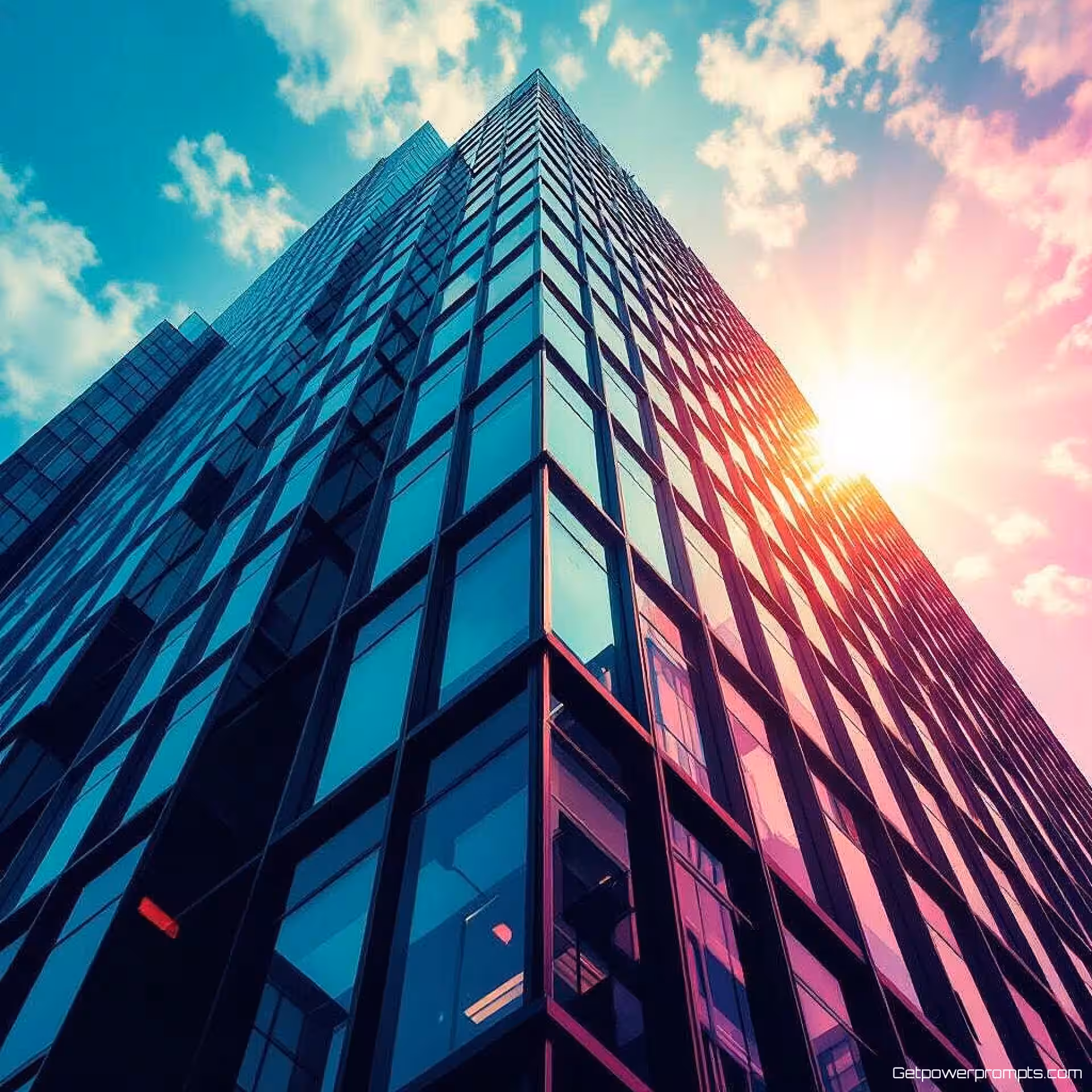 Contemporaine kantoor toren, infrarood architectuurfotografie, close-up perspectief perspectief, fel zonlicht belichting, dramatische atmosfeer atmosfeer, vals kleurenspectrum, professionele architectuurfotografie, scherpe focus, surrealistisch landschap, dramatisch contrast, cyaan en rood kleurenschema kleurenschema, spectrale effecten, atmosferische vervorming