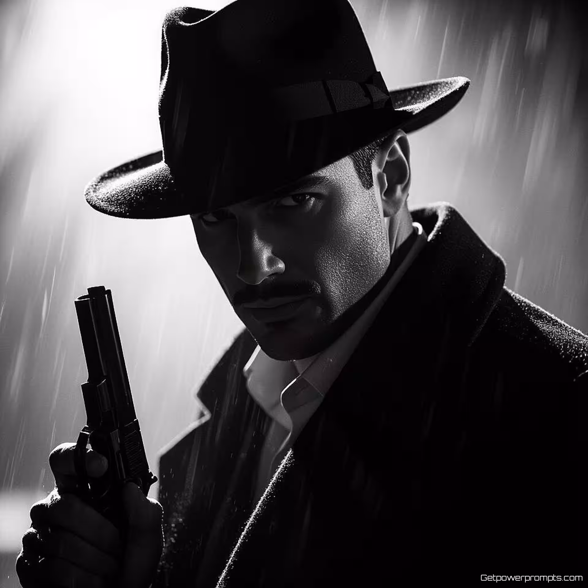 Detective met fedora, cinematografische zwart-wit fotografie, klassieke film noir, dramatische lage hoek perspectief, dramatische chiaroscuro belichting, dreigende sfeer sfeer, dramatische verhaalvertelling, film noir esthetiek, hoog contrast monochroom, atmosferische schaduwen, professionele kwaliteit