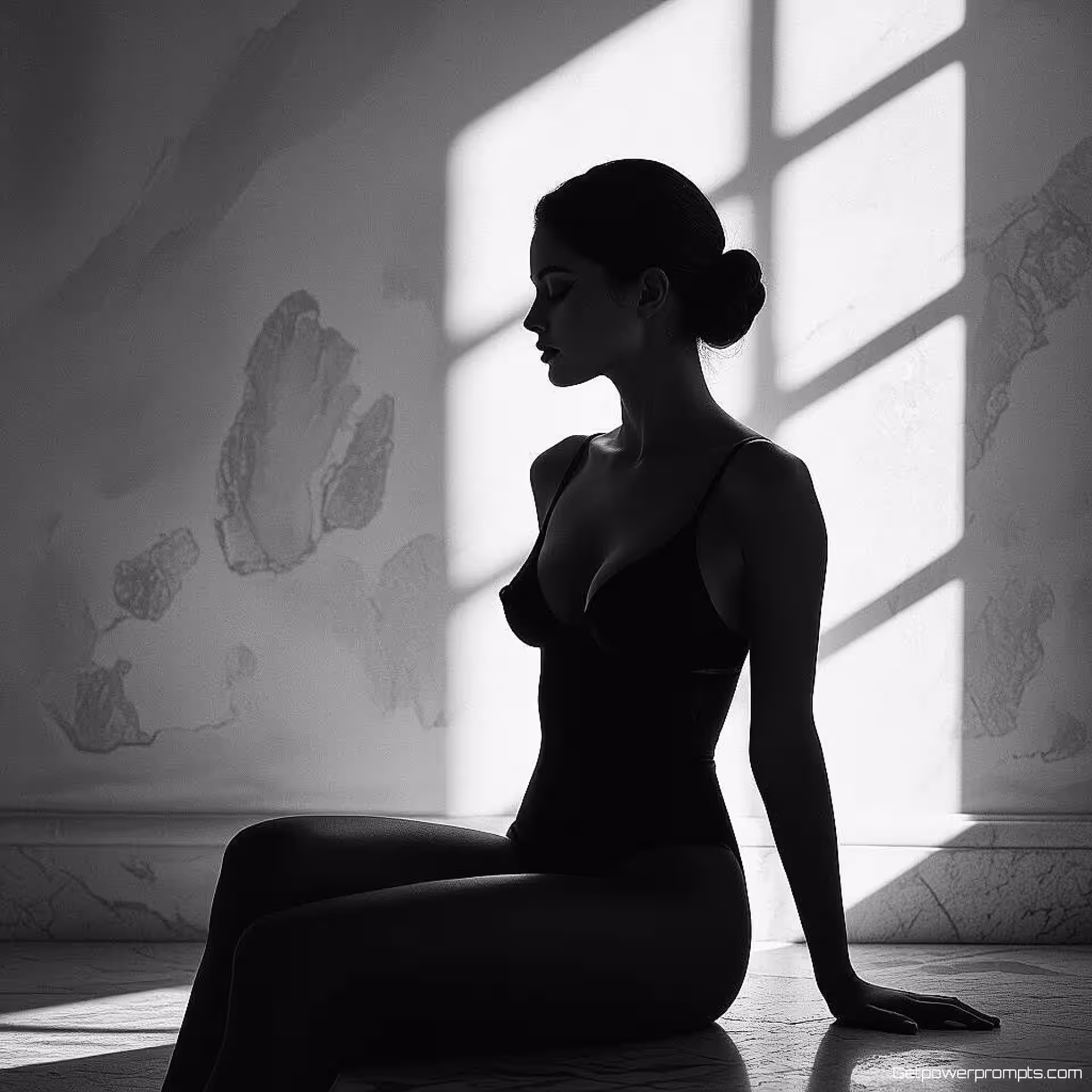 Vrouwelijk figuur, zwart-wit fijne kunst naaktfotografie, hedendaags, volledig lichaam perspectief, dramatisch belichting, intiem atmosfeer, artistieke vormstudie, monochrome tonen, textuurdetails, dramatische schaduwen, elegante compositie, fijne kunst esthetiek, professionele kwaliteit