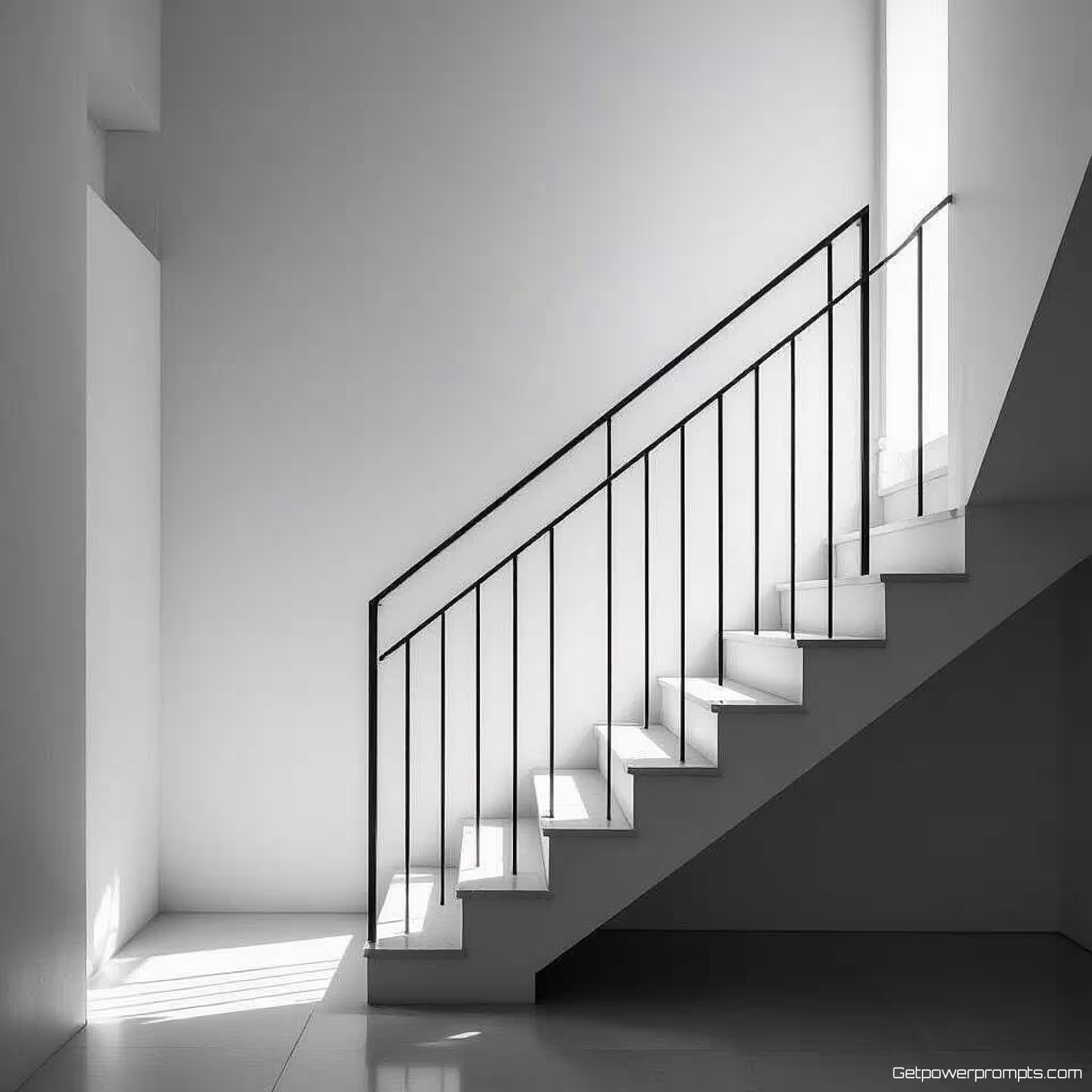 Traphek, zwart-wit minimalistische fotografie, gecentreerd perspectief, zachte natuurlijke belichting belichting, serieus sfeer, schone lijnen, negatieve ruimte, geometrische eenvoud, monochrome tonen, fijne kunst esthetiek, professionele kwaliteit
