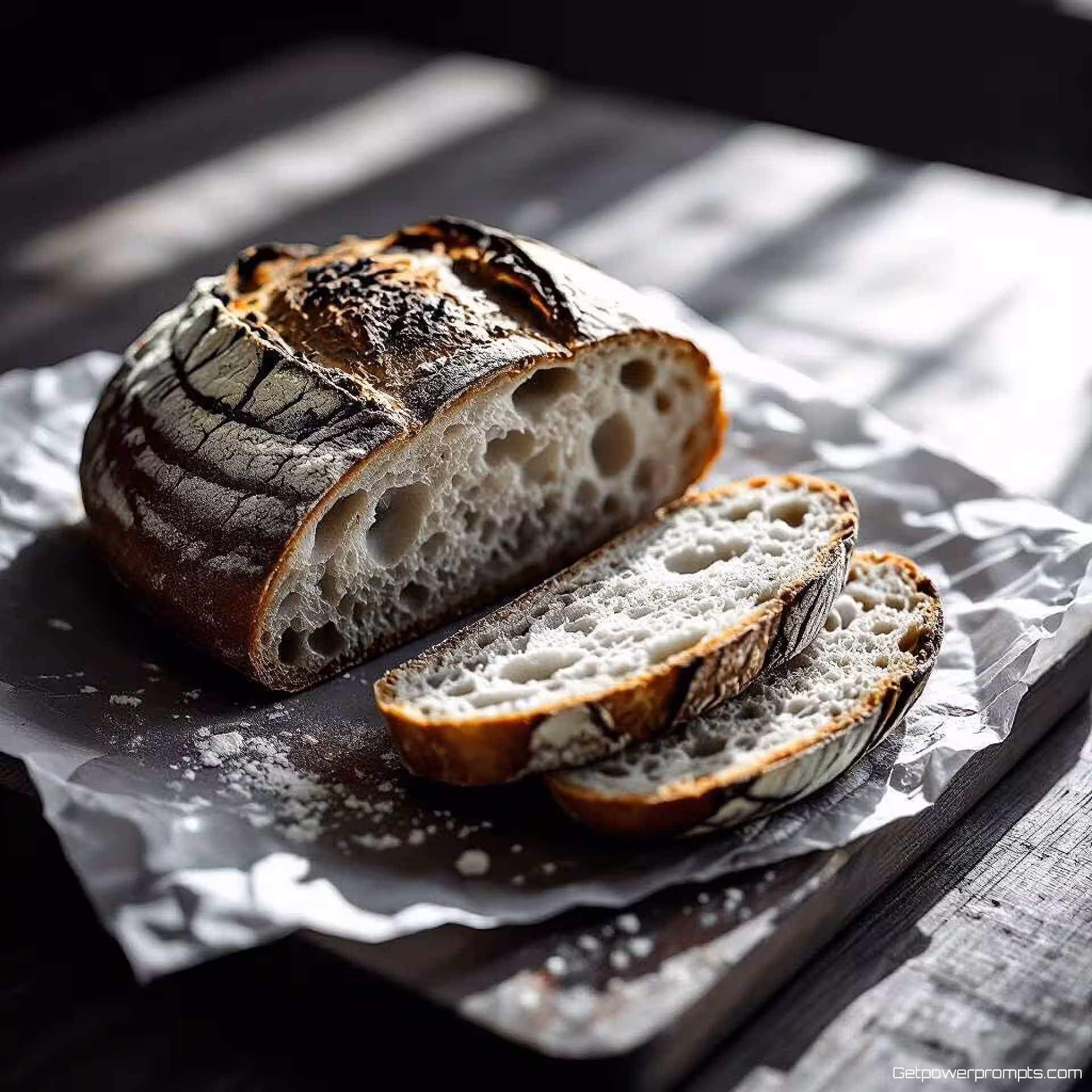 Ambachtelijk zuurdesembrood, zwart-wit voedsel fotografie, documentair, close-up perspectief, dramatisch belichting, dramatisch sfeer, culinaire presentatie, textuur details, monochrome tonen, fijne kunst esthetiek, professionele kwaliteit, dramatische schaduwen