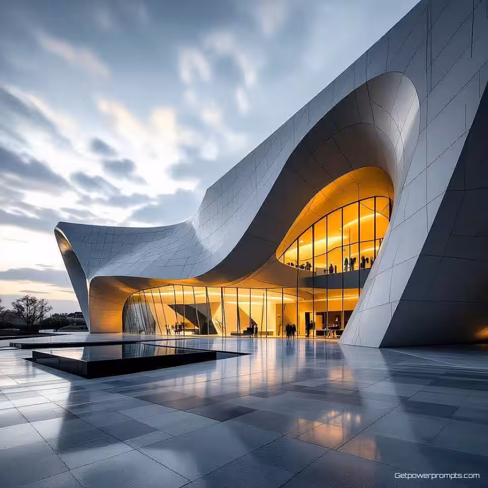 Hedendaags museum, architectonische kunstfotografie, dramatisch stijl, laaghoek perspectief perspectief, gouden uur licht belichting, monochroom palet kleurenschema, epische sfeer sfeer, galeriekwaliteit print, museumtentoonstelling esthetiek, geometrische compositie, professionele kunstfotografie, archiefkwaliteit print, dramatische architectonische details