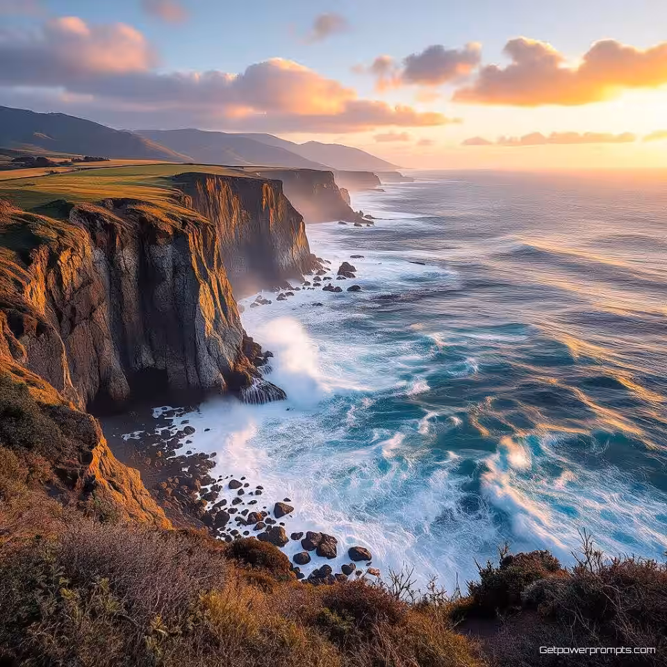 Dramatische kustkliffen met oceaangolven, fotokunst landschapsfotografie, impressionistische schilderachtige stijl stijl, groothoek panoramisch perspectief, gouden uur warm licht belichting, aards en natuurlijk kleurenschema, serene en vredig sfeer, galerij kwaliteit print, museumtentoonstelling esthetiek, professionele kunstfotografie, dramatisch natuurlijk licht, artistieke landschapscompositie, archiefkwaliteit print