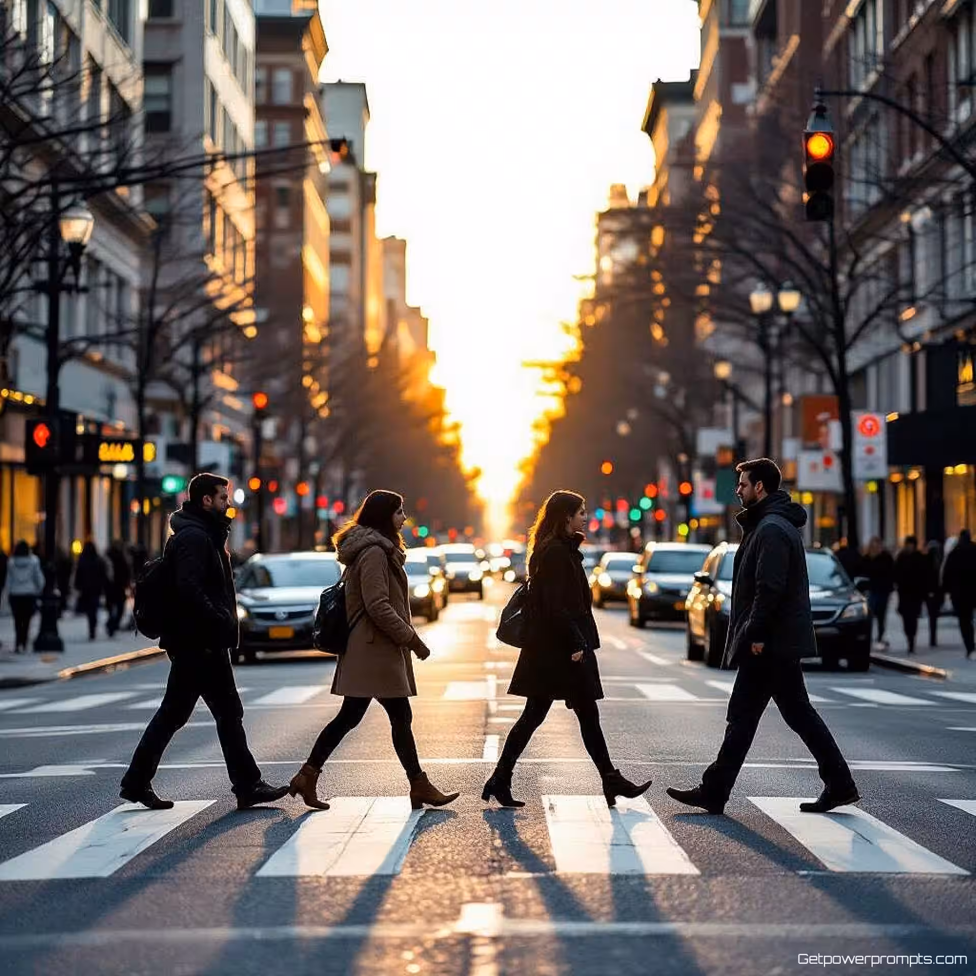 Stedelijke voetgangers die de straat oversteken, straatfotografie kunst, cinematische esthetiek esthetiek, groothoek perspectief perspectief, natuurlijk daglicht belichting, zwart-wit contrast kleurenschema, nostalgische sfeer atmosfeer, galerij kwaliteit print, museumtentoonstelling esthetiek, professionele kunstfotografie, spontane stedelijke momenten, archiefkwaliteit print, documentaire kunst esthetiek, straatleven compositie