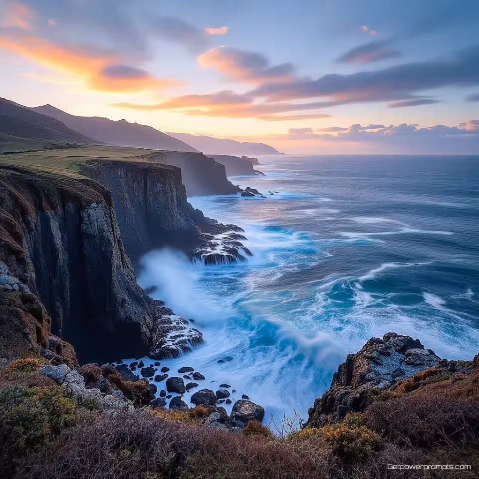 Kustkliffen met oceaangolven, HDR fotografie, zonsopgang zachte verlichting belichting, dramatische sfeer, groothoekcompositie, koel blauw kleurenpalet, verbeterd dynamisch bereik, levendige kleuren, professionele landschapsfotografie, scherpe details, hoog contrast