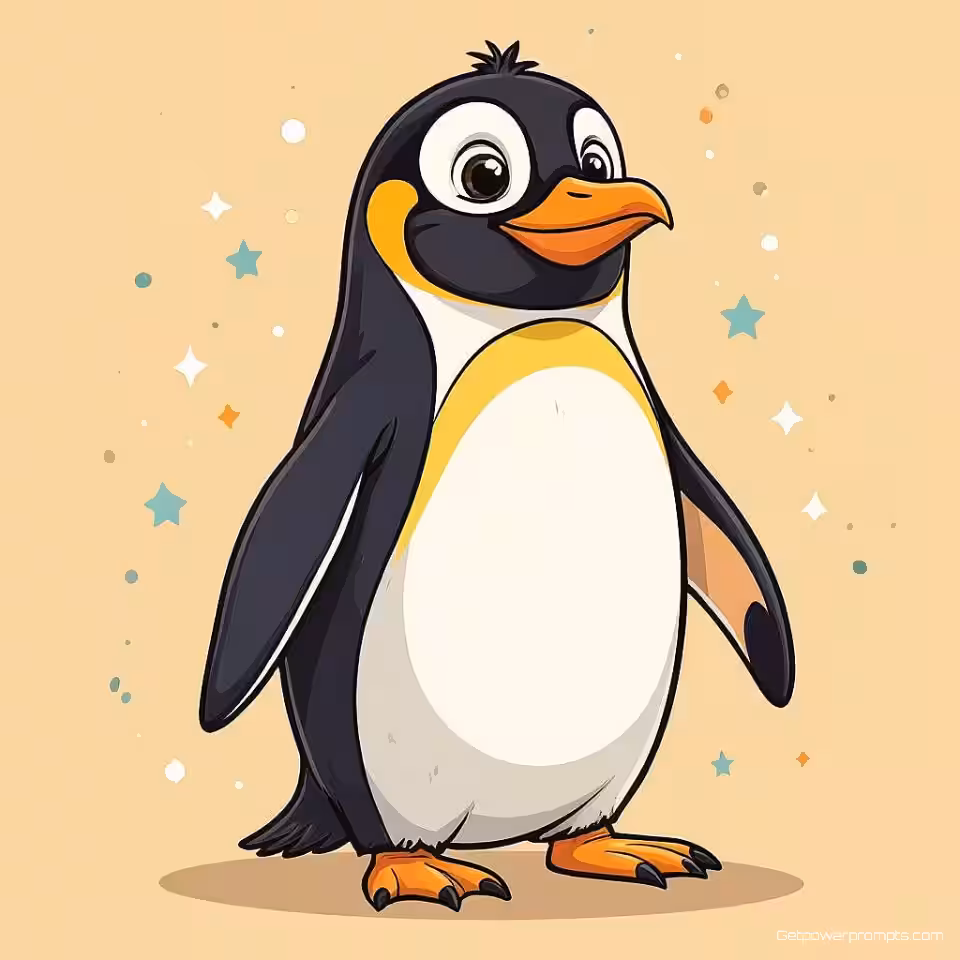 Een grappige pinguïn in een cartoon stijl, met een humoristisch en speels karakter. De pinguïn heeft expressieve gezichtsuitdrukkingen en levendige kleuren die de vrolijke sfeer versterken. De illustratie bevat gedetailleerd lijnwerk en een eenvoudige, effen gekleurde achtergrond die de aandacht op de pinguïn richt. De compositie is speels en dynamisch, waardoor het geheel een levendige en humoristische uitstraling krijgt. Deze digitale vectorkunst is perfect voor een vrolijk en kleurrijk project.